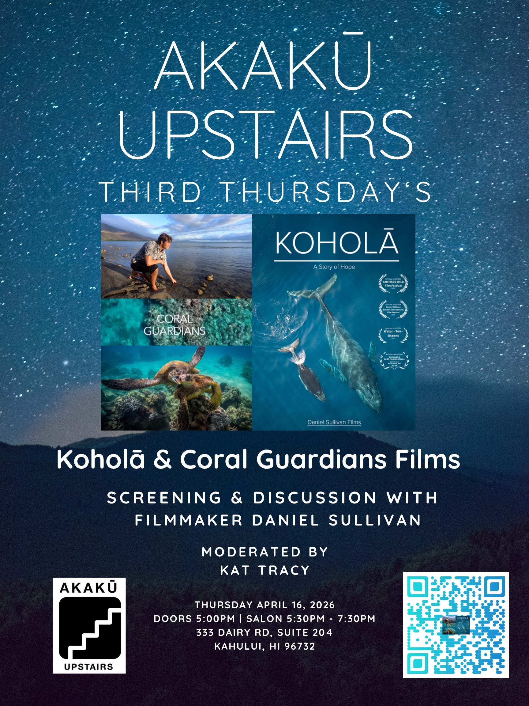 Offered on the third Thursday of each month at Akakū’s Media Lab, Akakū Upstairs is a community outreach program designed to bring Maui Nui together in person to share, learn, and be inspired by local stories, elevating community and conversation. Watch the Akakū Upstairs Playlist on demand on our free MauiStream app to catch up on past salons.